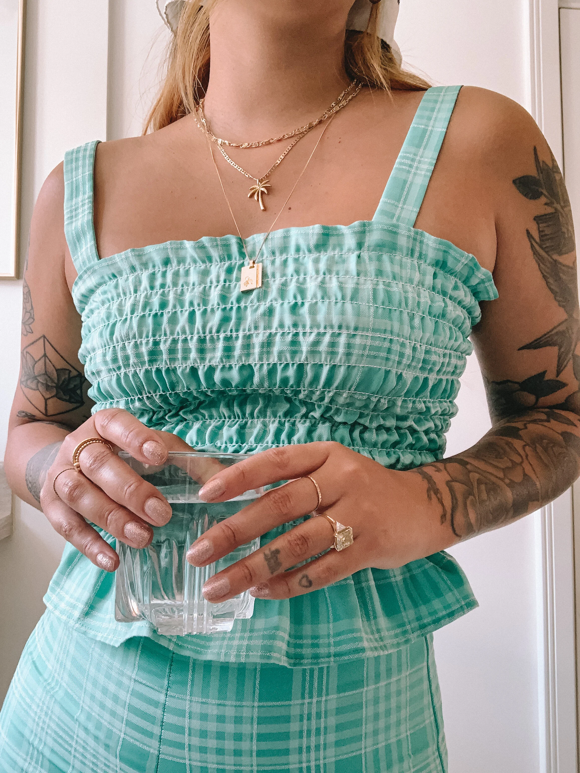 it’s been a dream of mine to hop back into a time machine and visit the 60’s. the music, the style and vibe is something i have a deep love for. i was introduced to a brand called extraaf who are sustainable and product everything in the uk. asked if i wanted to style something from the site i had a browse and saw this set and fell in love. i instantly knew how i would style it, what accessories and the vibe i was going for. not to mention this playful shade of green just made it even better. i added a silk scarf to my hair and paired this outfit with some cute vintage frames i picked up from bricklane a few years back. i would then also pair this outfit with either converses for comfort or some white blocked heels or wedges!